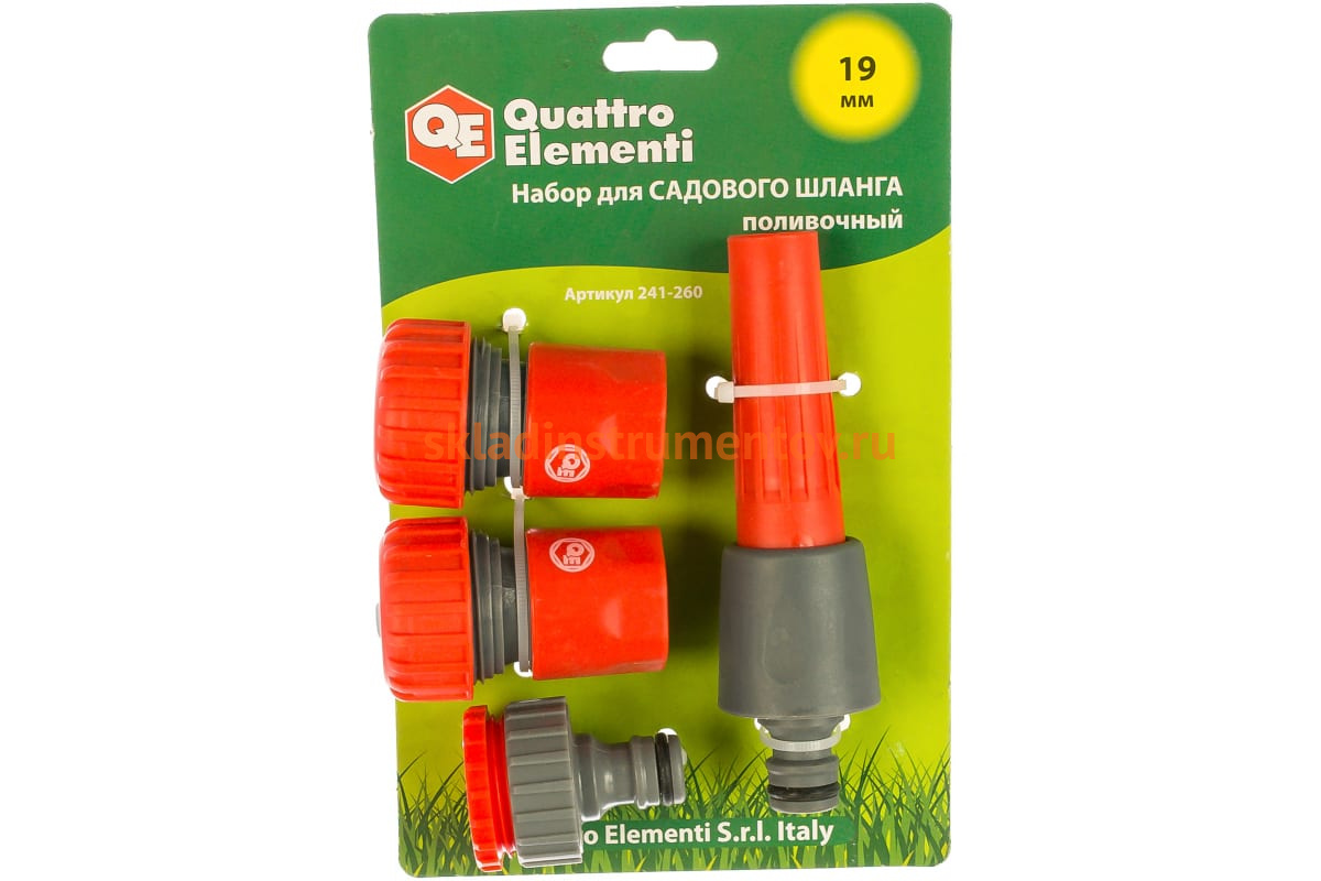 Набор поливочный QUATTRO ELEMENTI 241-260 является составной частью быстросъемной соединительной системы QUATTRO ELEMENTI и используется при поливе растений. Приспособления выполнены из пластика, который отличается легкостью и прочностью. Набор позволяет собрать с помощью шланга диаметром 19 мм (3/4") поливочную линию и подключить ее к водопроводной трубе или крану с внешней резьбой 1/2" или 3/4".