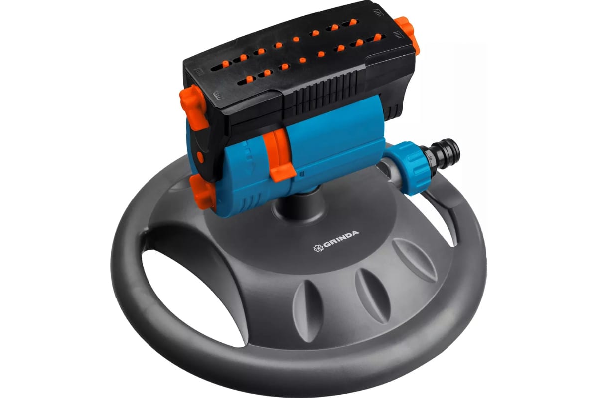 Веерный распылитель на подставке GRINDA PROLine RO-16m 16 форсунок 429349 используется для полива газона и растений на участке.