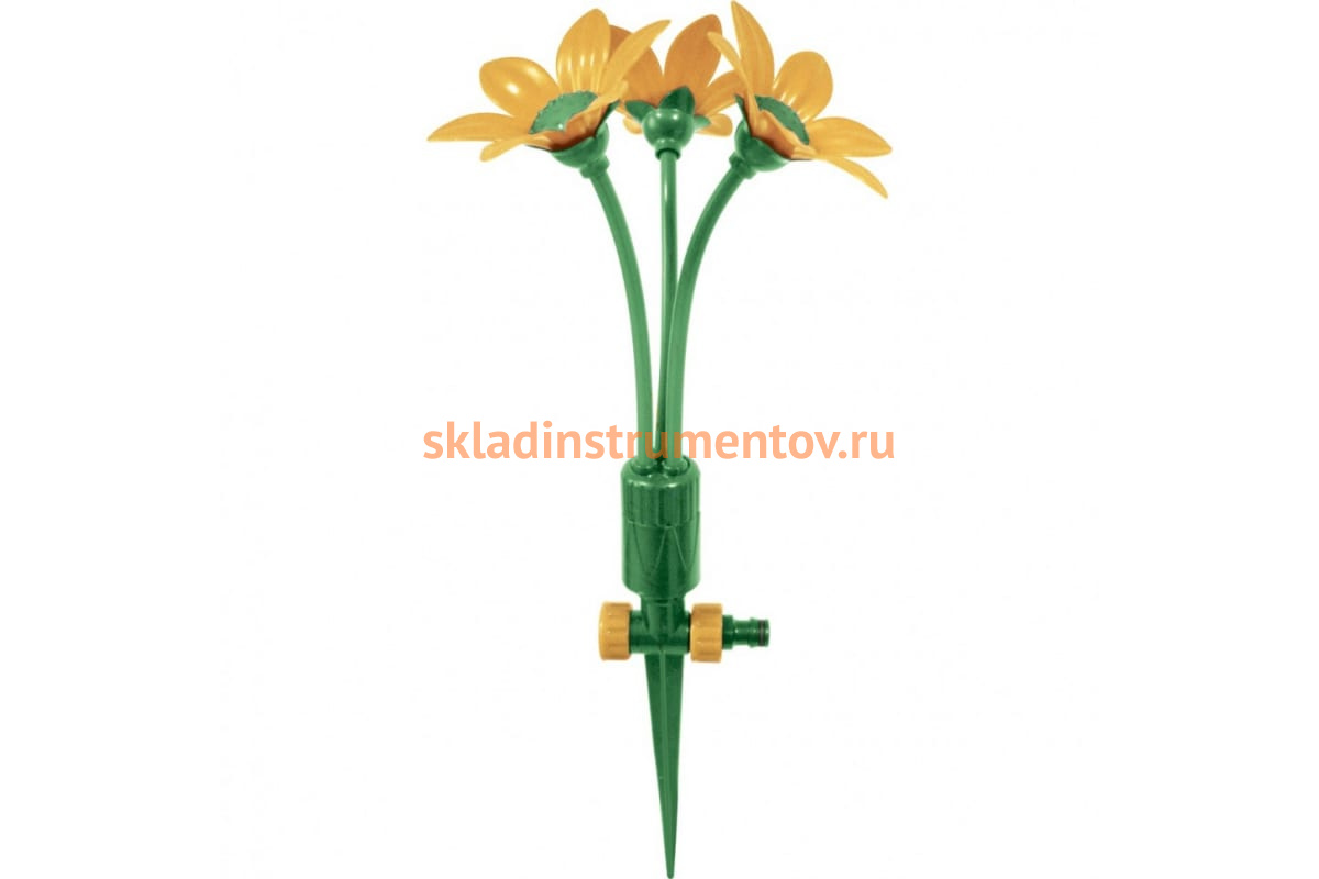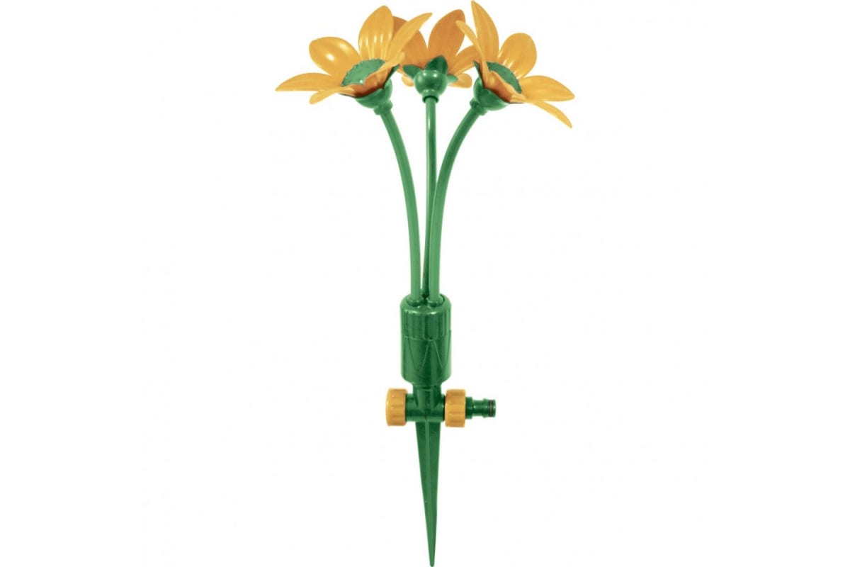 Пластиковый разбрызгиватель на пике PALISAD Букет 65429 предназначен для стационарного полива на садовых, дачных, приусадебных участках, в парках, скверах и т.д. Изготовлен из прочного пластика, имеет штуцерную посадку и штырь-пику для надежной фиксации в почве. Состоит из трех цветков, каждый из которых имеет в центральной части 16 радиально расположенных форсунок, благодаря которым в процессе работы устройства создается эффект трехстороннего душа. Головки отклоняются на стеблях и обеспечивается равномерный полив площади до 75 кв.м.
