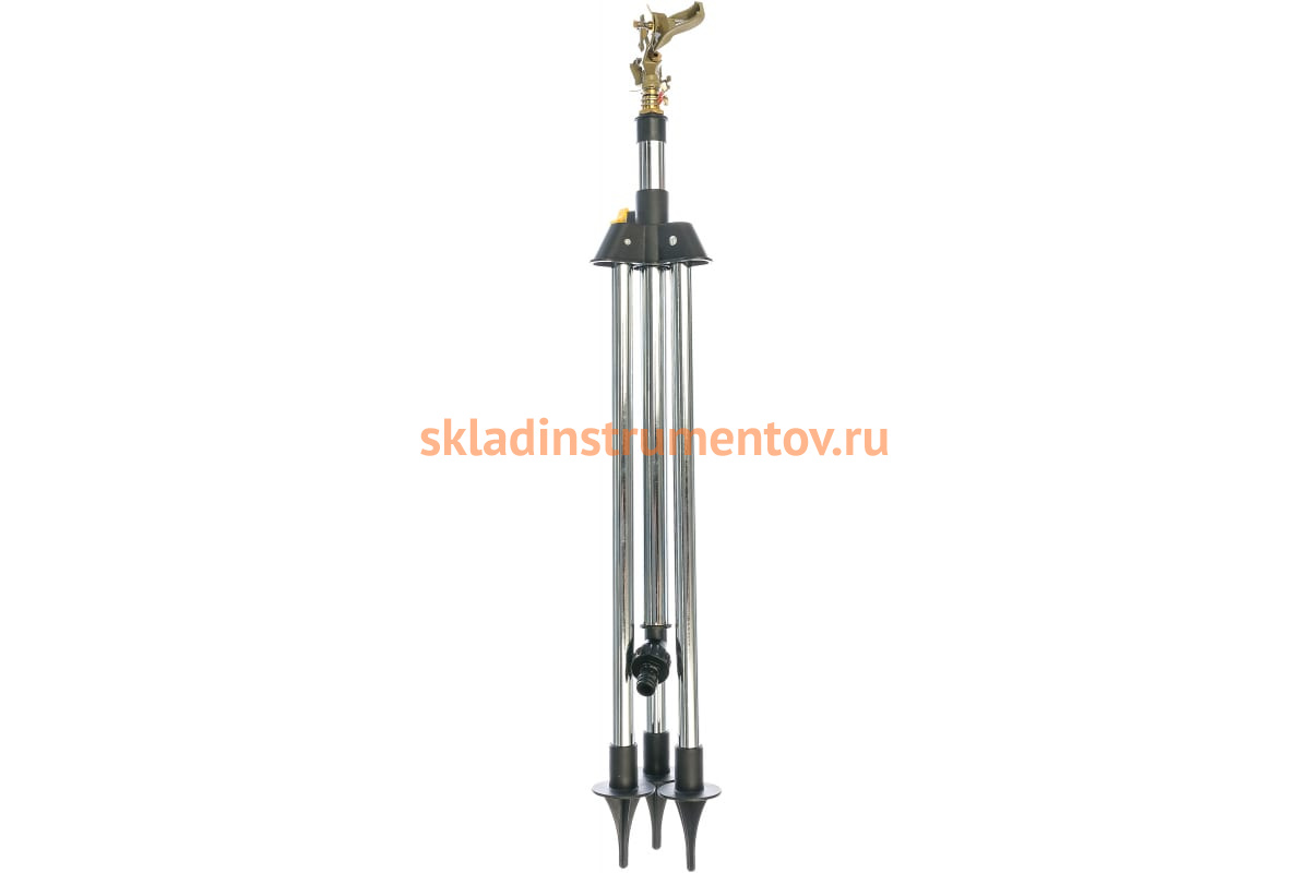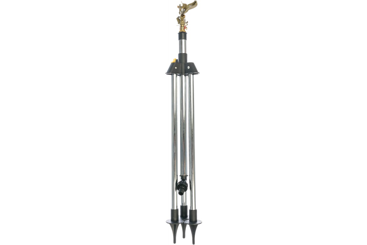 Распылитель импульсный "CLASSIC Quick-Connection System" Grinda 8-427661_z01 предназначен для стационарного полива насаждений на садовом и дачном участке площадью до 450 м2. Для подключения к водопроводной системе необходим соединитель. Треноге из хромированной стали обеспечивает надежное крепление устройства на поверхности почвы и сохранение установленного сектора полива неизменным. Возможно изменять угол полива поворотом головки от 0 до 3600, а также высоту путем выдвигания штатива на расстояние от 60 до 95 см. Изменение высоты орошения удобно для полива высоких кустарников. Приспособление выполнено из латуни высокого качества и цинкового сплава, устойчивого к образованию ржавчины.