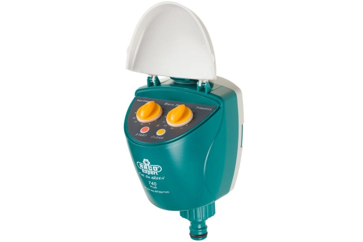 Таймер электронно-механический Raco 4275-55/736_z01 используется с системой для полива и орошения, обеспечивая автоматический контроль. Максимальная единовременная продолжительность полива 120 мин. Возможность удобной установки времени и продолжительности полива с помощью двух переключателей, на одном из которых устанавливаются минуты, на другом - часы. В день можно совершать до 8 поливов. На откидываемой крышке располагается подробная инструкция по эксплуатации с обозначением всех кнопок и регуляторов. Приспособление обеспечивает удобство и комфорт в уходе за садом и огородом, ведь нужно просто установить таймер и полив пройдет в то время, как пользователь будет заниматься своими делами вдали от сада. Работает от двух батареек АА, которой хватит на весь сезон (приобретается отдельно). Устройство подключается к водопроводному крану с резьбой G 3/4" или G1".