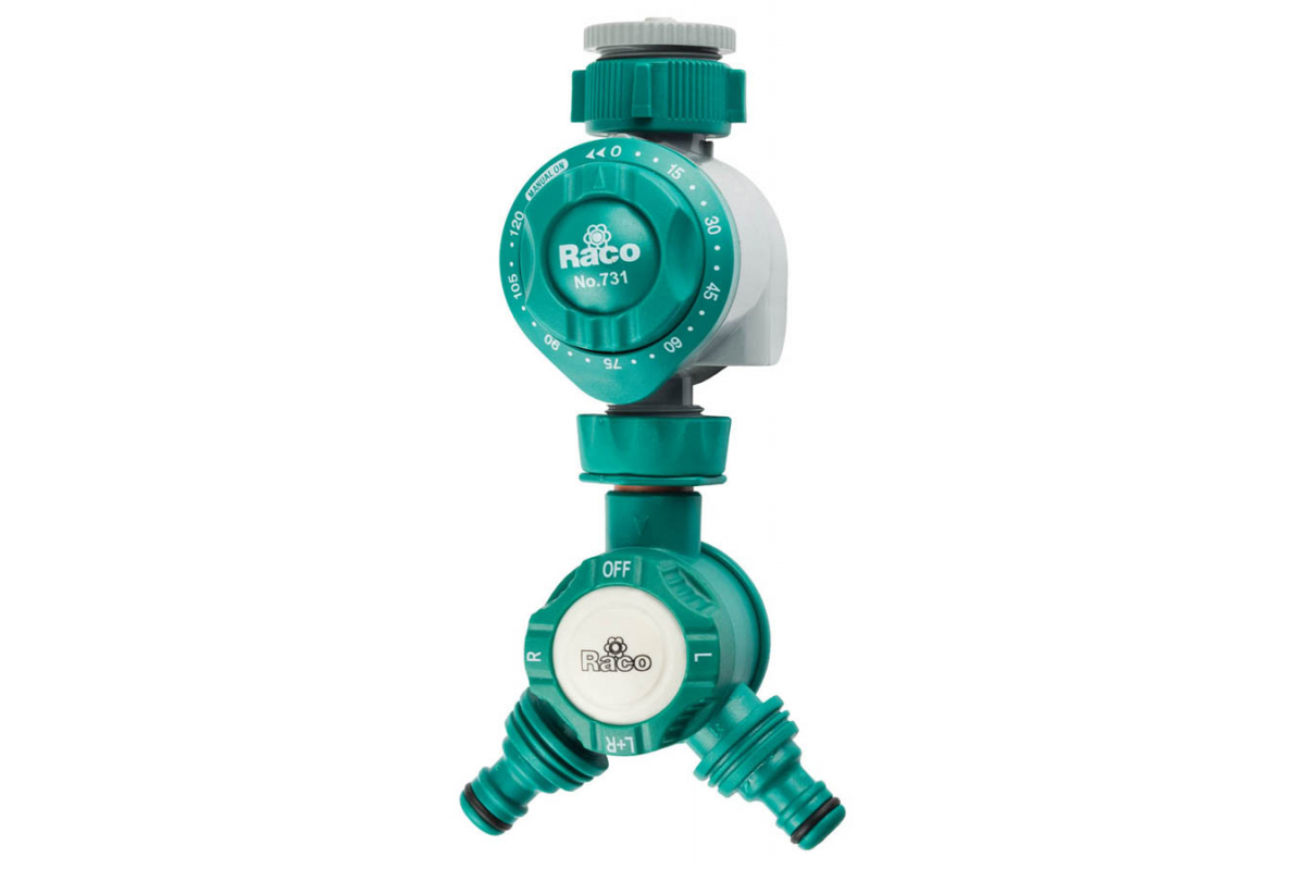 Механический таймер для подачи воды в комплекте с двухканальным распределителем Raco 3/4"х1" 4275-55/732D используется для полива и орошения садового участка.