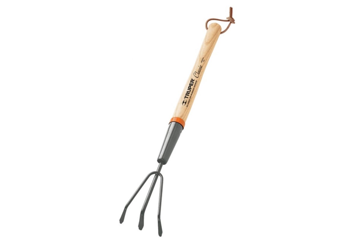 Садовый культиватор Truper GTL-CV 15036 используется для ручной аэрации почвы на грядках и клумбах. Инструмент прост и удобен в работе. Он состоит из металлической рабочей части с тремя зубцами и деревянной ручки, которая надежно закреплена в манжете.
