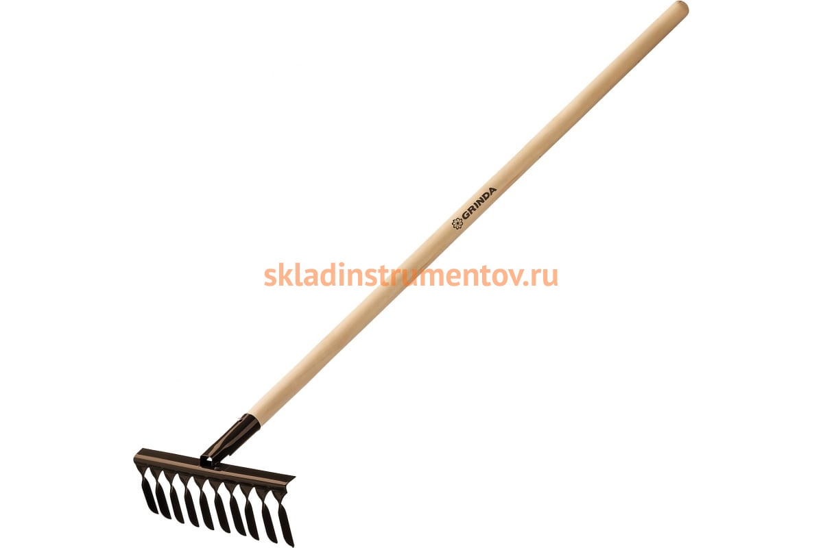Садовые грабли с деревянным черенком GRINDA 10 витых зубьев, 320х95х1300 мм 39581-10 используются для очистки придомовой территории от скошенной травы, опавших листьев и другого мусора. Также применяются для выравнивания и рыхления почвы на грядах и клумбах. Благодаря витым зубьям сухой мусор отлично удерживается рабочей частью. Грабли изготовлены из стали и укомплектованы деревянным черенком, благодаря чему инструмент полностью готов к использованию.