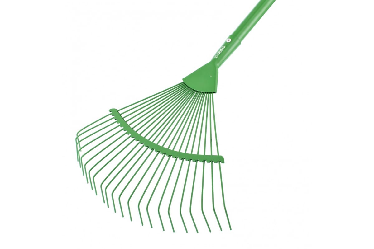 Веерные стальные грабли PALISAD 420х1585 мм, 22 круглых зуба, эмалированные 6177155 используются для уборки листвы и мусора на дачном участке.
