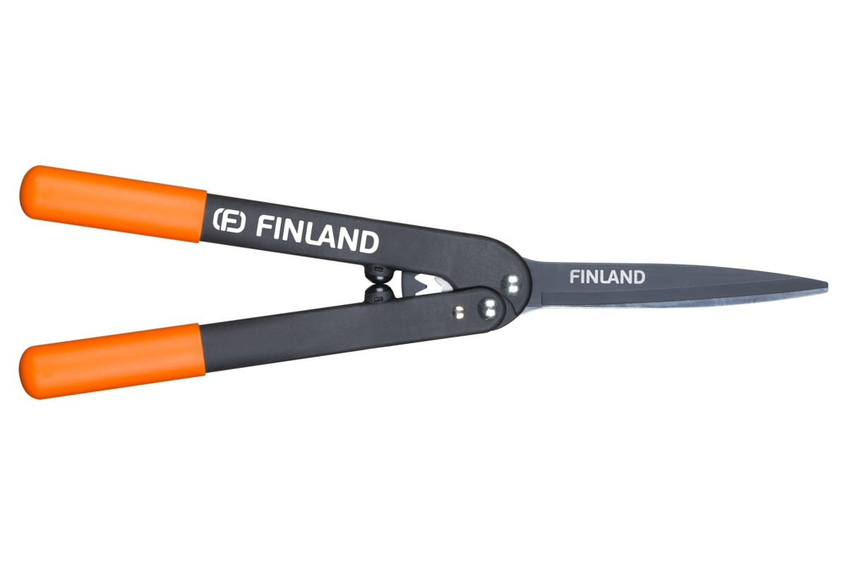 Садовые ножницы для живой изгороди Центроинструмент FINLAND 1711 имеют длинные рукоятки. Лезвия изготовлены из стали SK-5. Специальное покрытие AntiStick предотвращает прилипание листвы и коры к лезвиям. Двухкомпонентные рукоятки выполнены из фибергласа и нейлона для лучшего соприкосновения с ладонями при работе.