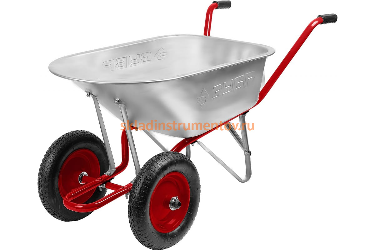 Садово-строительная двухколесная тачка Зубр Т-21 180 кг 39952 имеет цинковое покрытие для защиты корыта от воздействий окружающей среды.