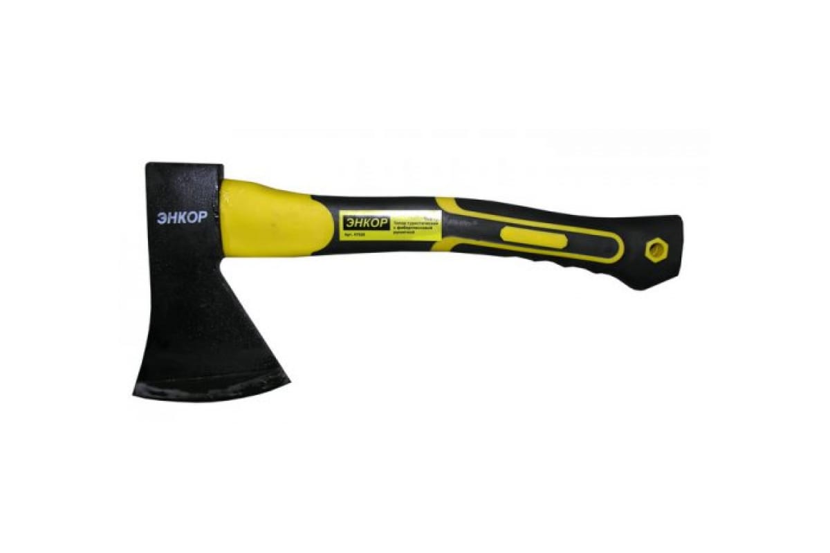 Туристический топор Энкор 800г 47028 высококачественный прочный инструмент с укороченной рукояткой, для удобства хранения и размещения топора в рюкзаке или поясной подвеске. Кованные стальные кромки лезвия инструмента закалены до твердости 52..58 HRС. Топор оснащен фибергласовой рукояткой с накладками для удобства удержания.