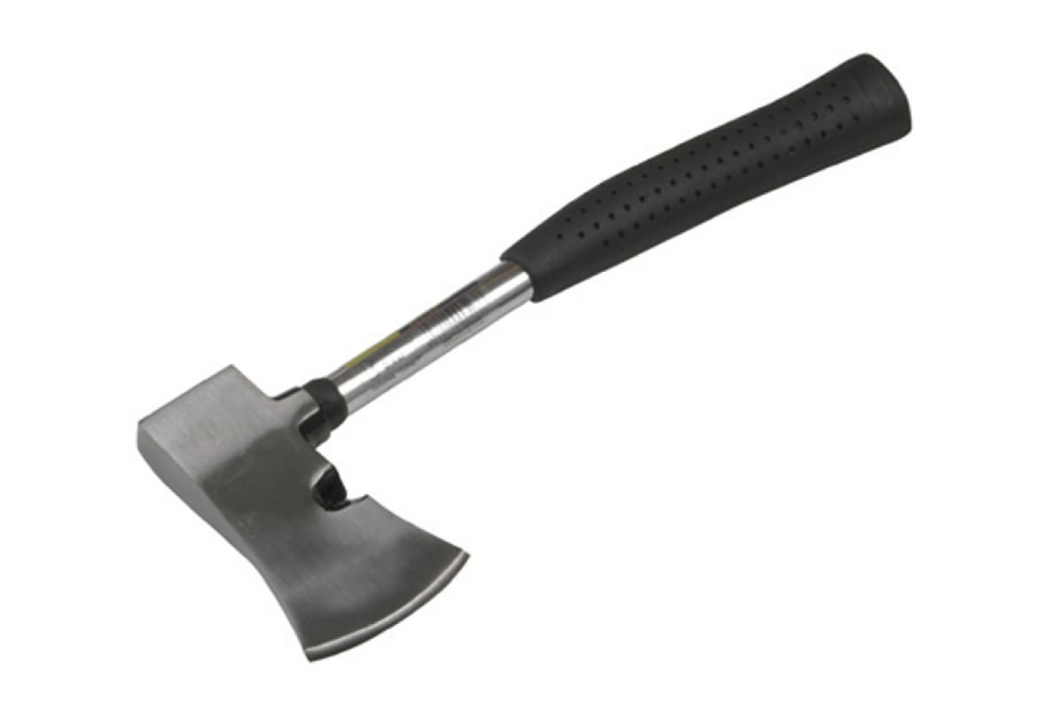 Топорик STAYER "ТУРИСТ" 2064-06 представляет собой кованый цельнометаллический инструмент весом 0.6 кг, имеющий обрезиненную рукоятку и защитный чехол для лезвия. Используется для валки деревьев, рубки веток.