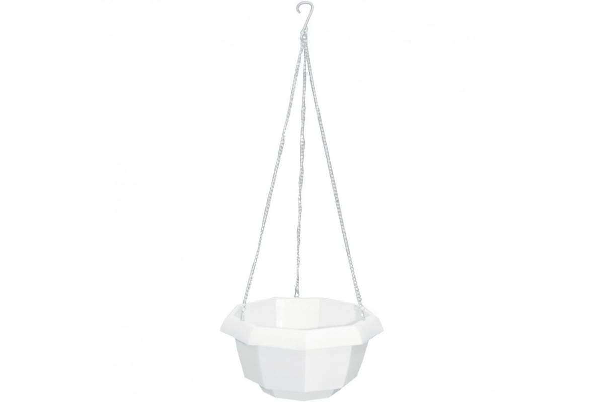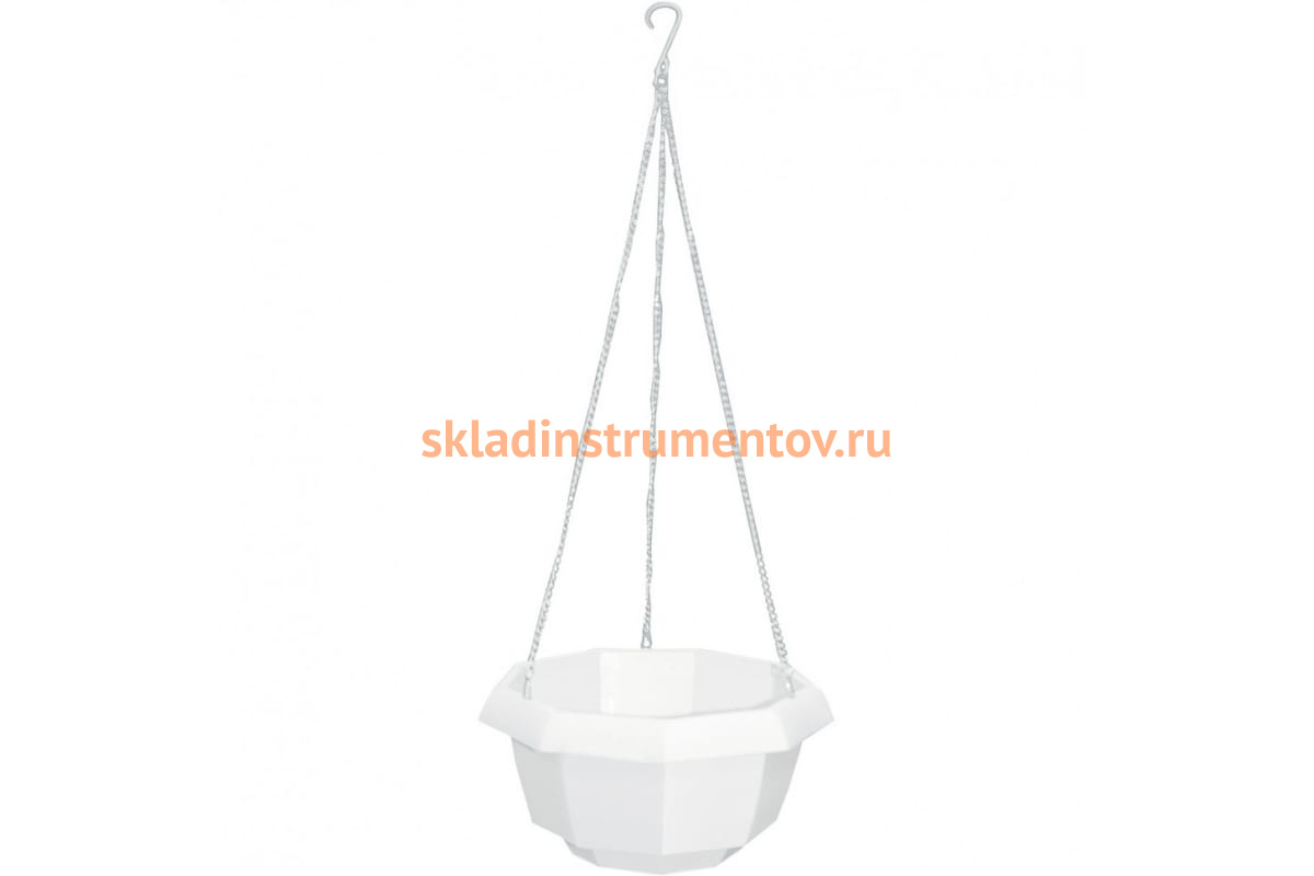 Корзина кашпо выполнена из прочного пластика и имеет многогранную форму. Для подвешивания предусмотрены три цепочки, объединенные удобным крюком.