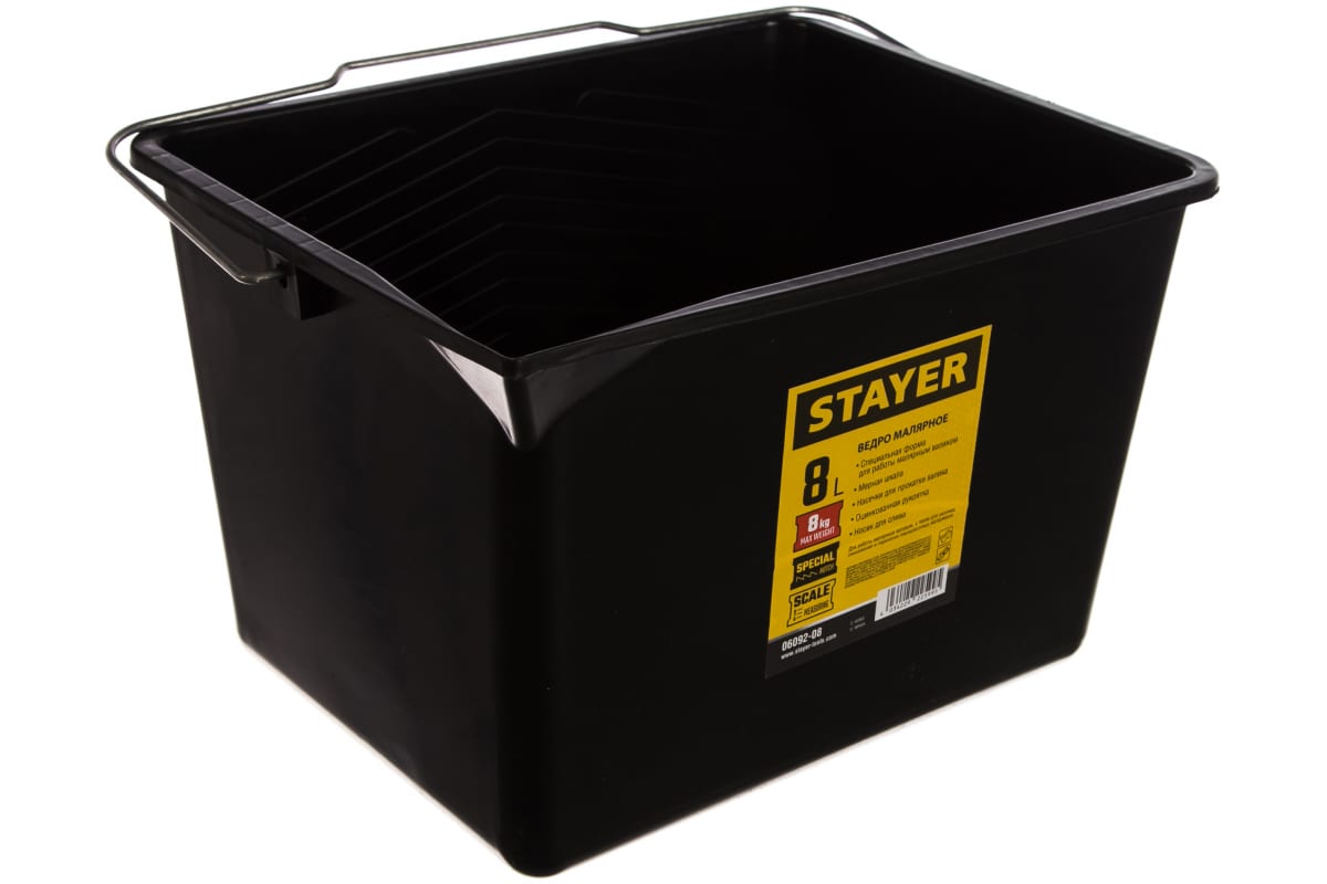 Малярное пластмассовое ведро, 8 л STAYER 06092-08 предназначено для разлива и смешивания ЛКМ. Отлично подходит для работ с малярным валиком.