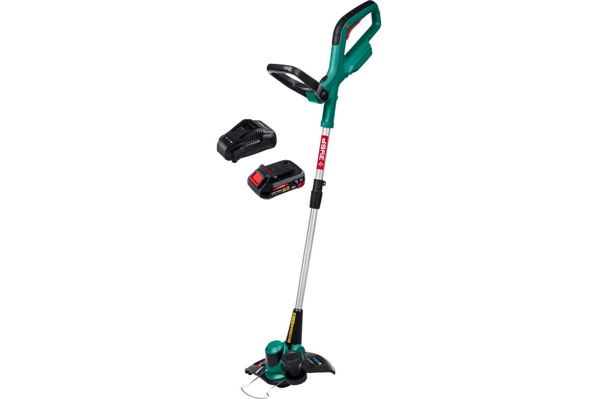 Аккумуляторный триммер ЗУБР 18В, 1 АКБ 2 А*ч ТА-185-21 используется для ухода за газоном, скашивания травы и сорняков.